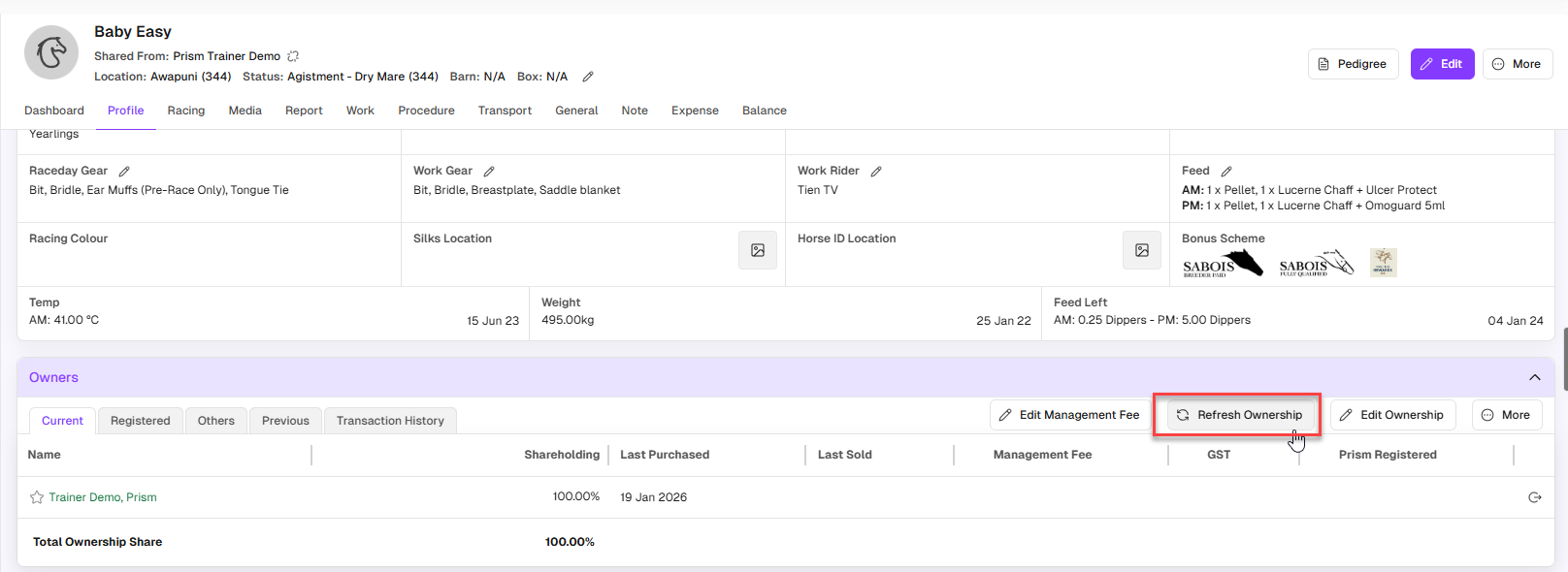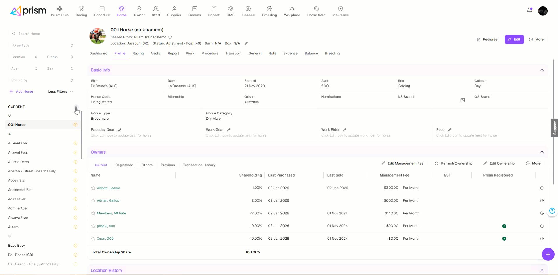 View Ownership In Owners section, you can view and manage detailed ownership information of a horse. The Current tab list displays the active owners and their shareholdings. You can click on a row to expand/collapse transaction history View ...