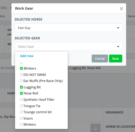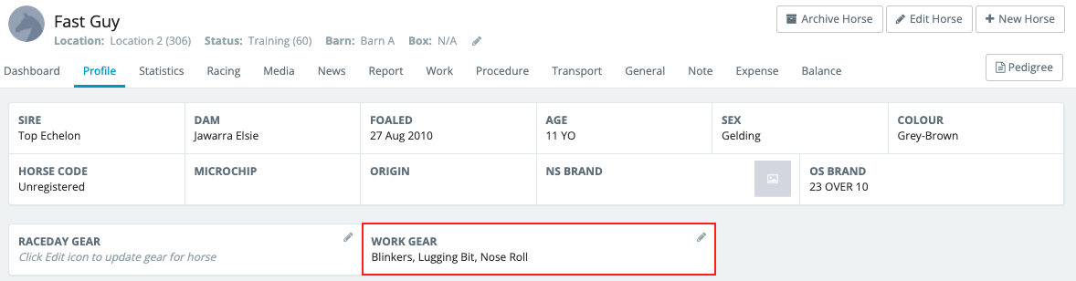 On each horse's profile, you can assign the default work gear that each horse wears or carriers during track work.