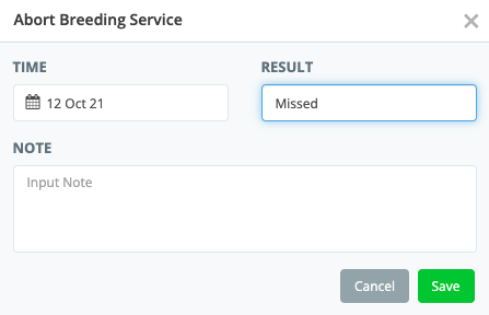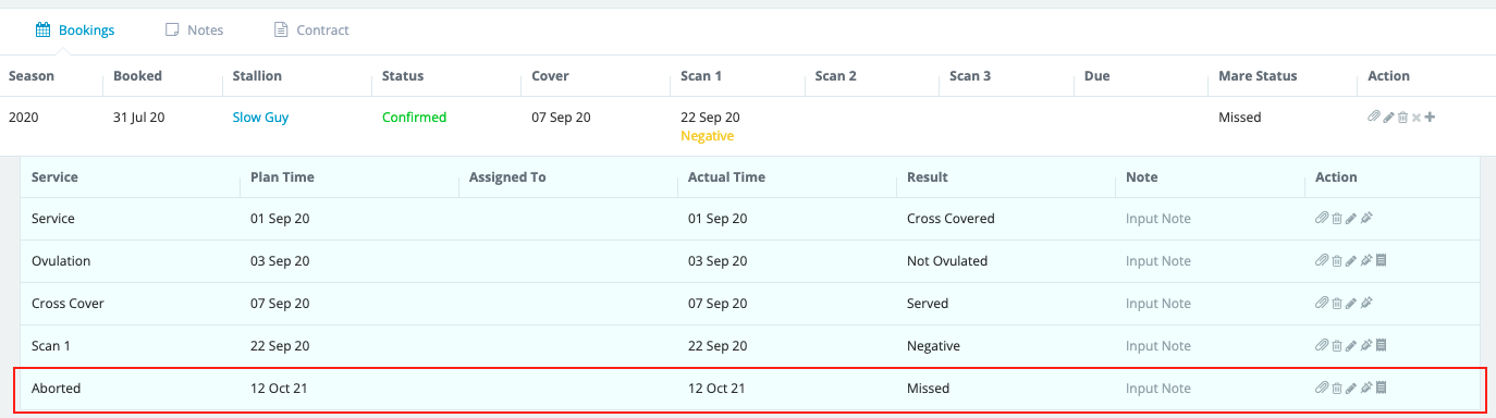 In Prism, you can click the Abort action in the Mare Profile > Breeding screen, which will allow you to specify the mare's last known status (e.g. missed or slipped) and remove any and all pending breeding tasks linked to that season's stallion booking.