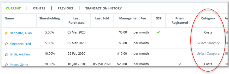 The Category of the appointed Managing Owner is set to “Costs” as default. Other Owners need to be categorised.
