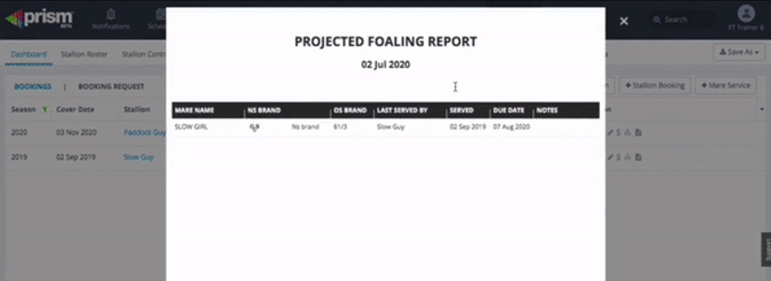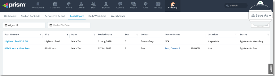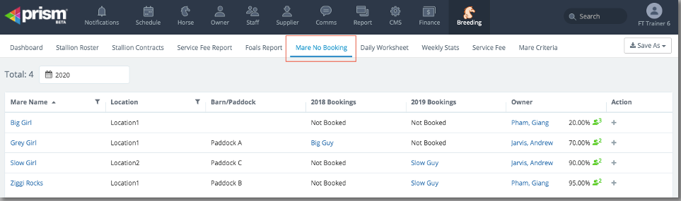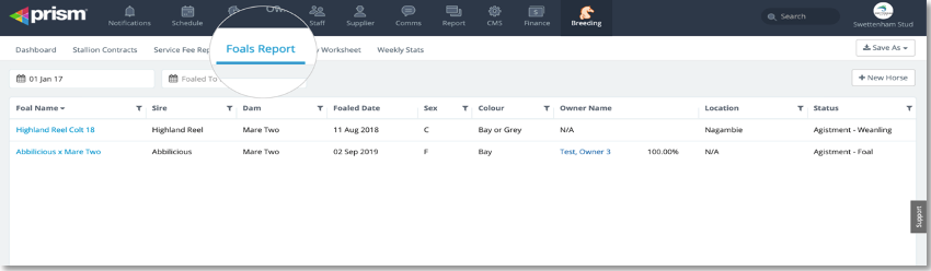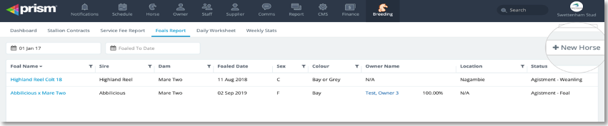 The Breeding features within Prism enables Stallion and Broodmare farms to manage: Stallions and Broodmares as different horse types; Stallion service fees [Stallion Farms]; Bookings to outside (off farm) Stallions; Bookings to Standing Stallions ...