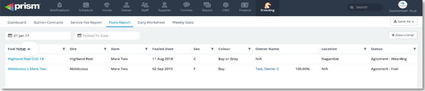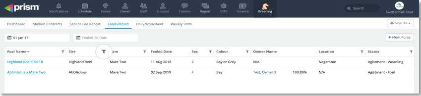 You can filter the list by Foal Name, Sire, Dam, Sex, Colour, Location, Status.