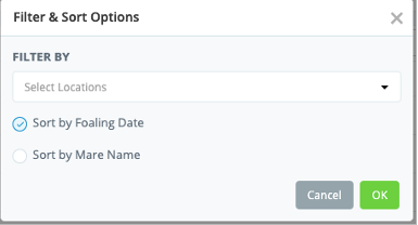 Optionally, click the filter icon to open the Filter & Sort Options window. Filter selected locations and choose whether to sort by foaling date (default) or by Mare name.