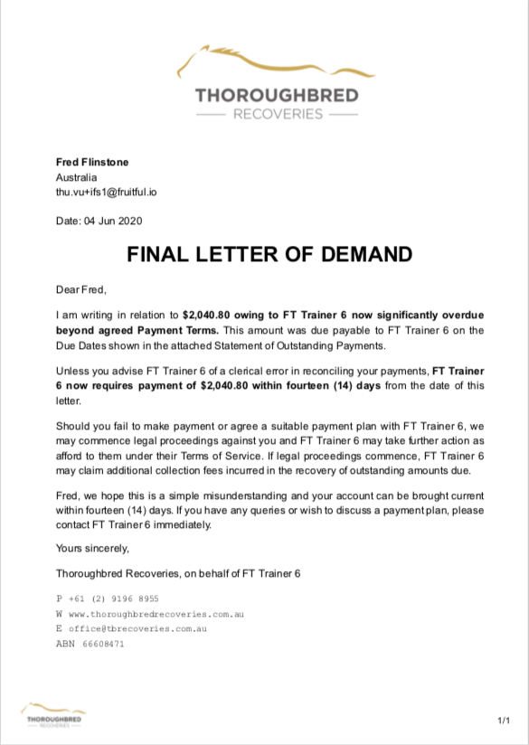 - A Letter of Demand is emailed to your customer demanding payment of the selected amount overdue, within fourteen (14) days.