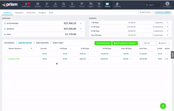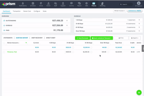 23 October 2019 | Prism Finance You can now view the amount owed by each owner, for each horse. Go to the Finance Account of the Owner, and then the BALANCE tab.