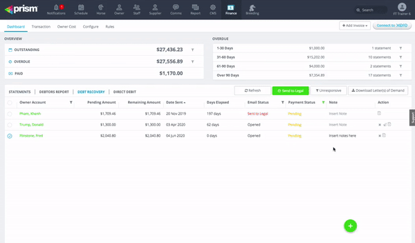 03 October 2019 | Prism Finance You can now send an owner or multiple owners a reminder on overdue accounts. This affords you the chance to remind owner(s) at any time, in addition to the normal Statements sent. In the Finance Dashboard, display ...