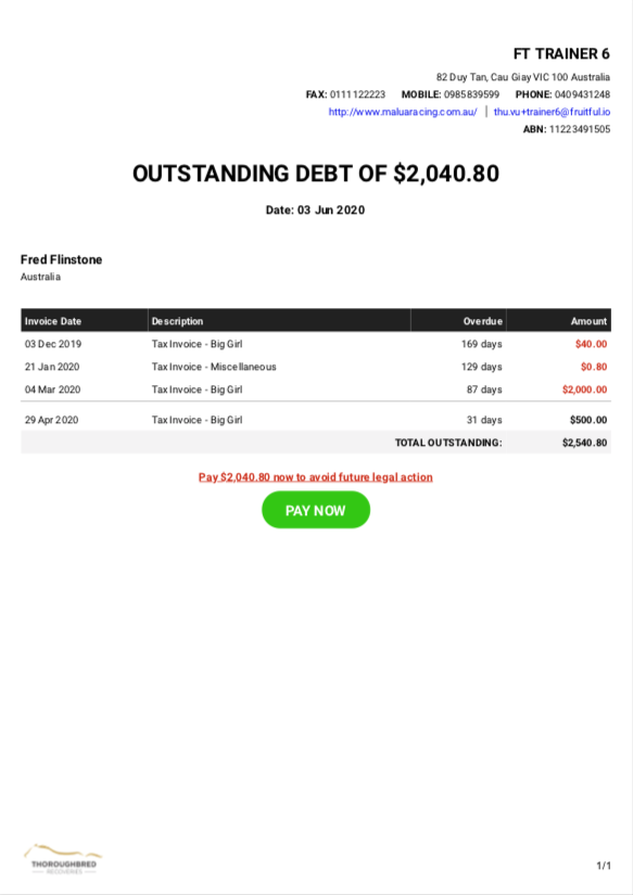 - A Statement of Outstanding Debt is also emailed, including a convenient Pay Now button (if you operate a Thoroughbred Payments merchant account).