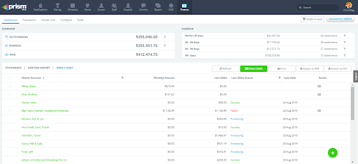 By choosing to integrate Thoroughbred Payments with your Prism Finance portal, you enable the following benefits: A PAY HERE button on each monthly Statement/Invoice sent which allows owners to easily pay the amount owed via credit or debit card; ...