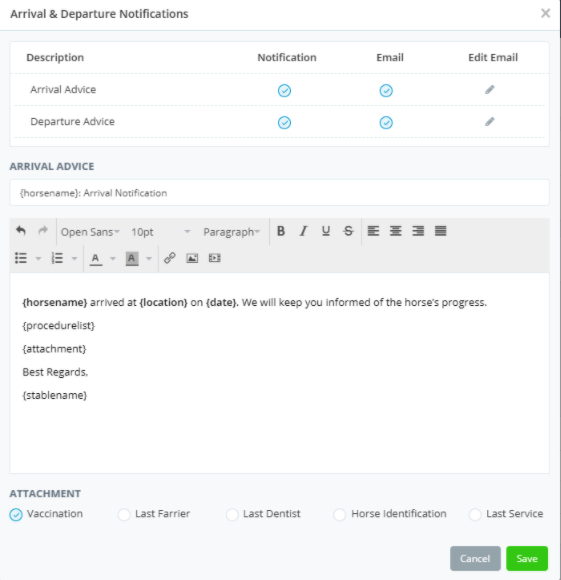 3. Click on the Edit action icon next to Arrival Advice, Departure Advice or Breeding Advice, to view and modify the default Email Body of the Notification.