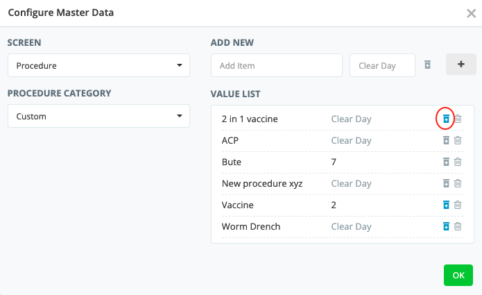 Procedures must be marked as Vaccinations via Master Config in order to appear in this Vaccination and Drenches filter.