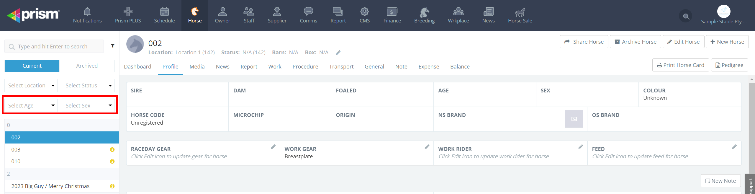 You can now filter horses by Sex and Age to help find your horses easier. Simply click on the drop down boxes highlighted in the screenshot below to help narrow down your search: