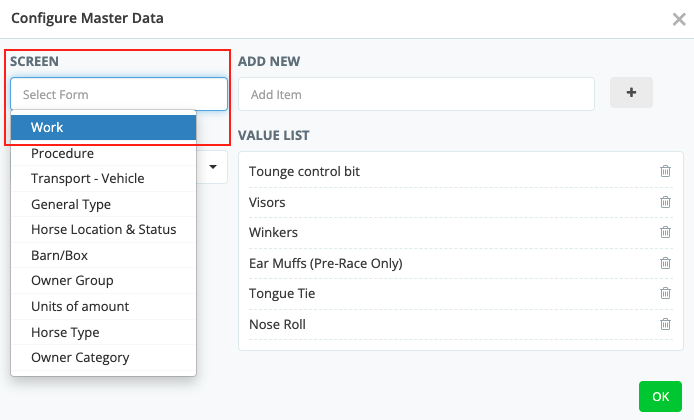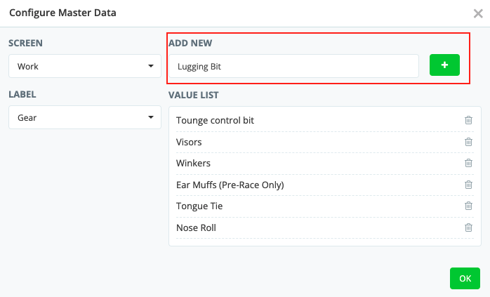 On each horse's profile, you can assign the default work gear that each horse wears or carriers during track work. Navigate to the horse profile then click the edit pencil in the Work Gear box. Select any relevant gear from the drop down Selected ...