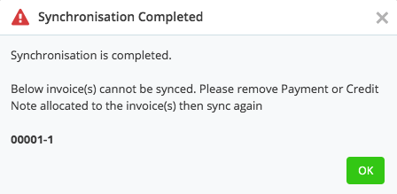 When you edit an invoice in Prism that has already been synced up to Xero, Prism will try to upload the updated version of the invoice to Xero. If there is a payment allocated to that invoice, the following message will appear: