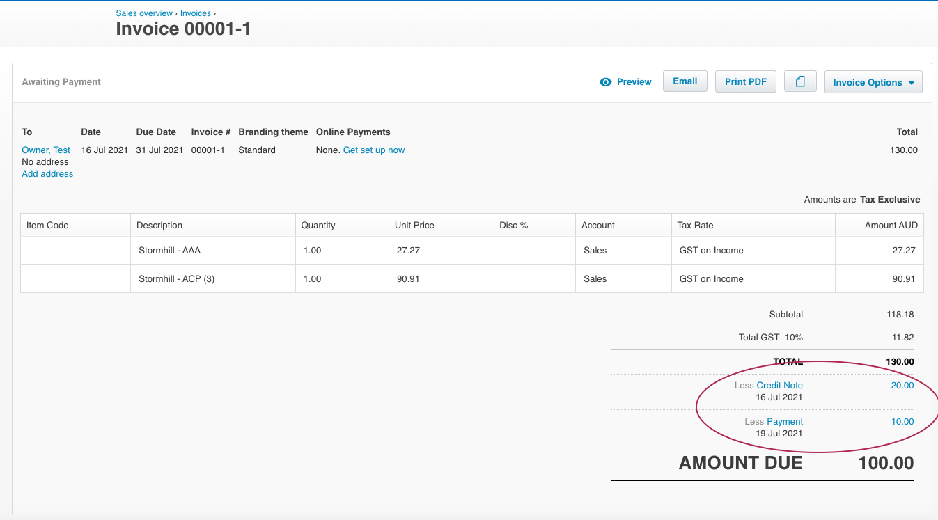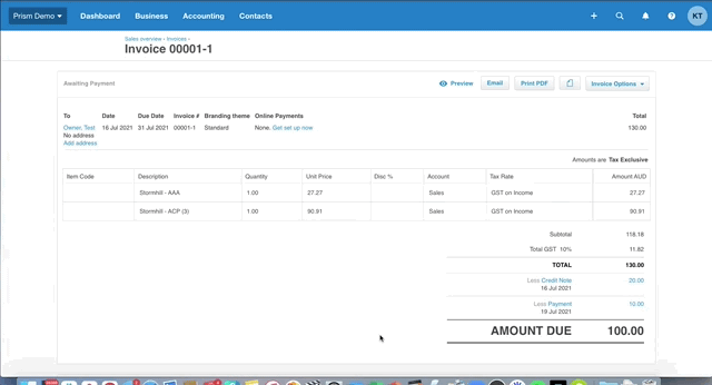 Here is a sample invoice showing both a credit and a payment allocated to it to reduce the outstanding amount due. Because this invoice has a payment and a credit applied to it, it cannot be modified (either manually in Xero or by syncing Prism and Xero).