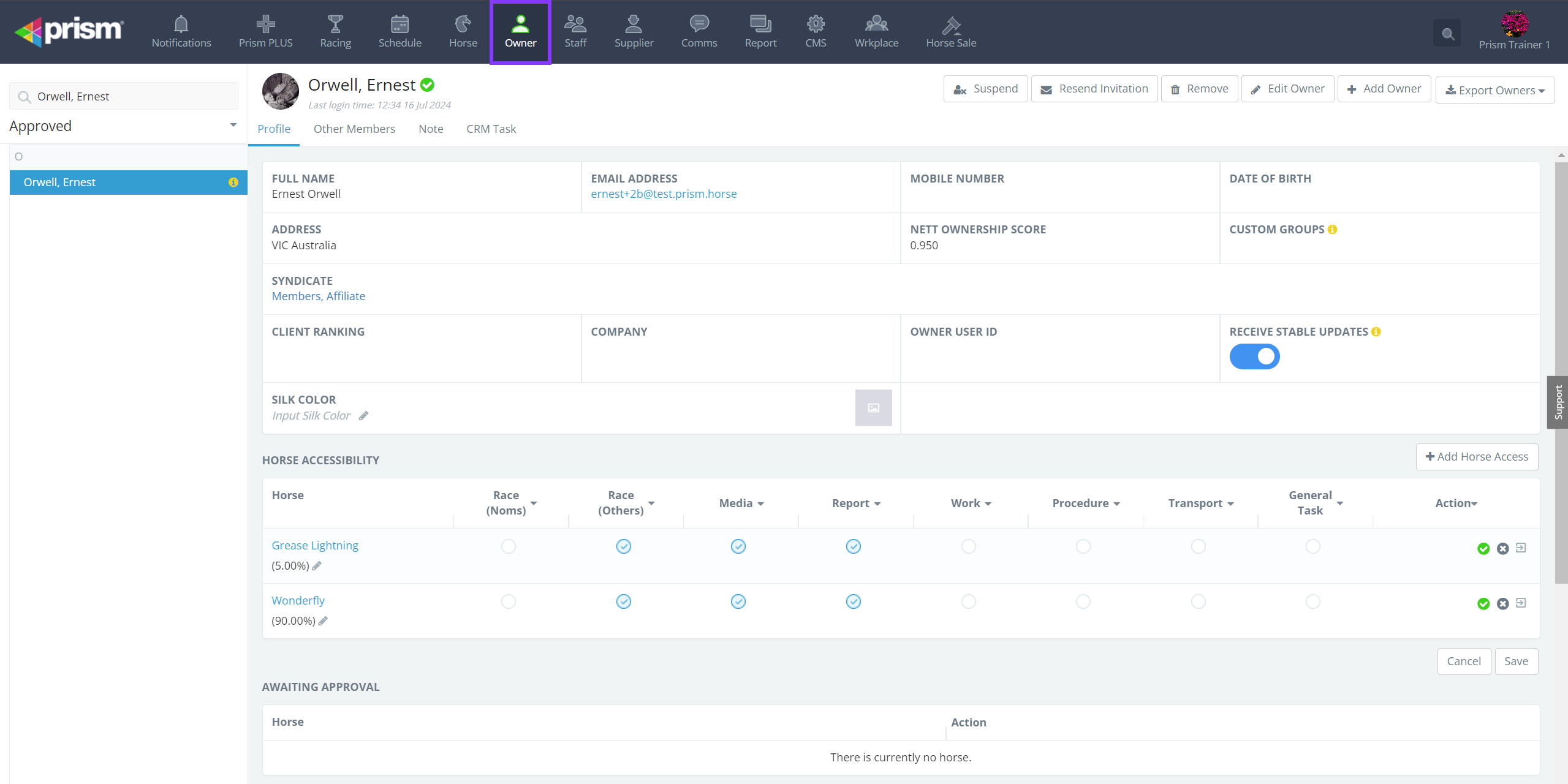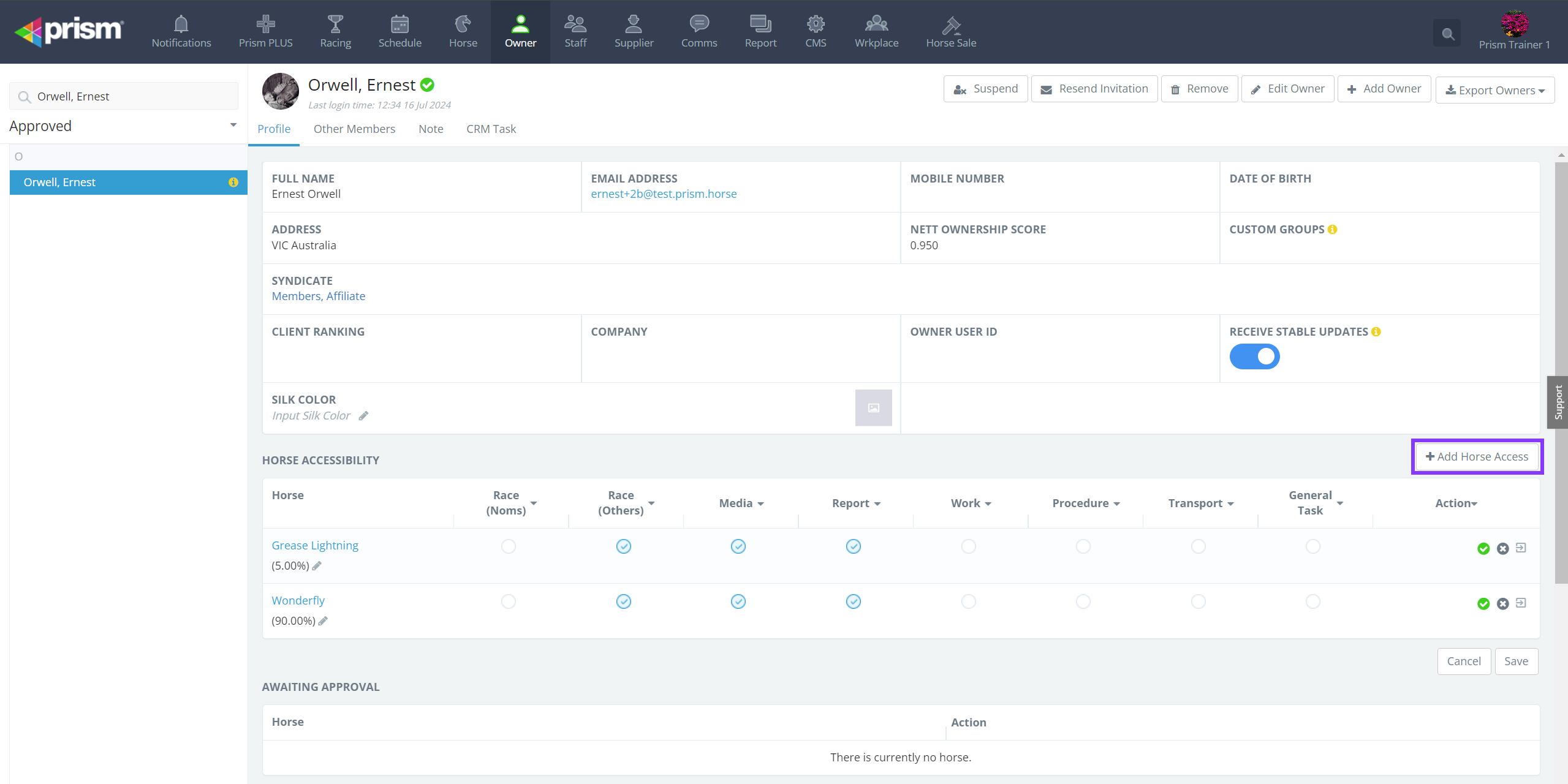 Prism receives a Daily Registration File from Racing Australia at 9am every day where it updates all transfers of ownership and / or trainer. After lodging your Stable Return to accept a new horse into your stable, it may take a day or two for Racing ...