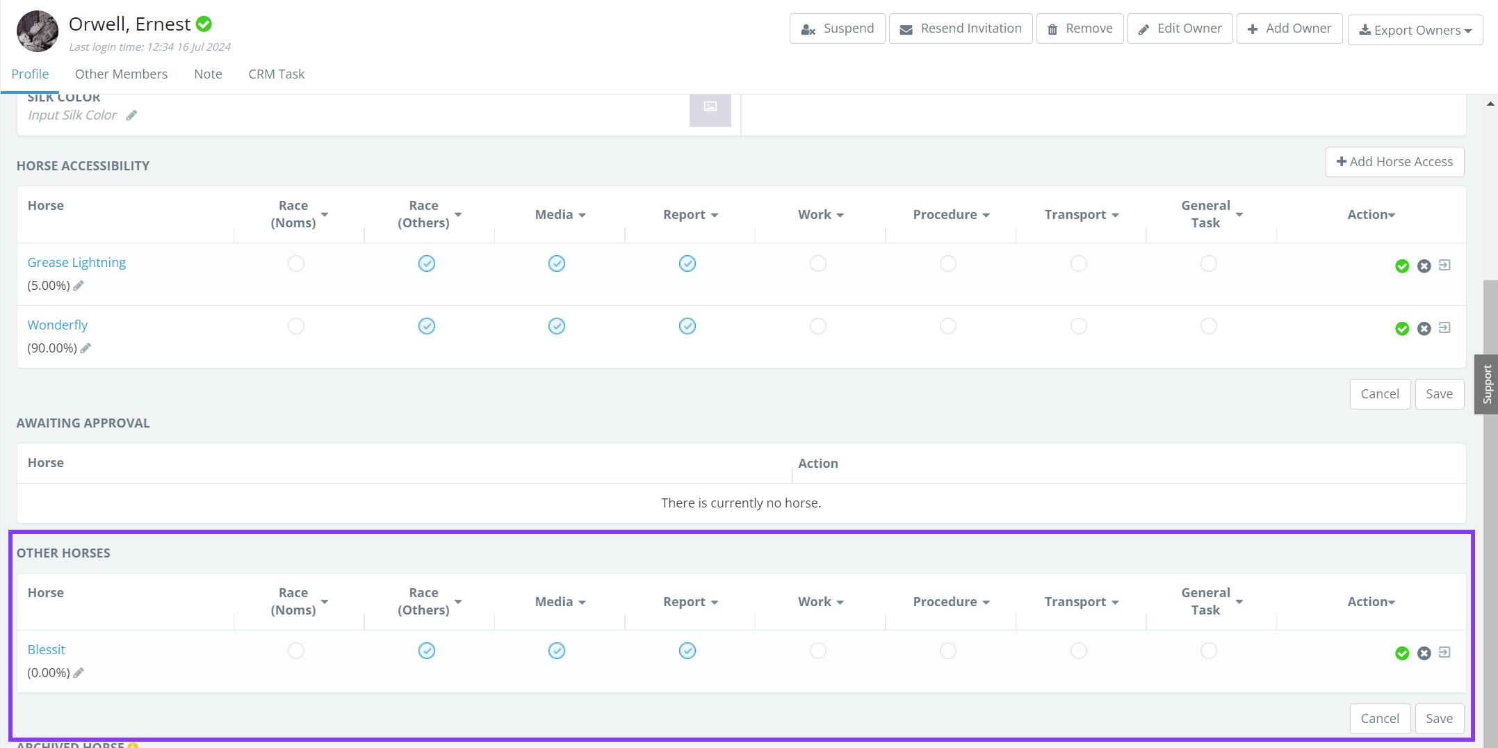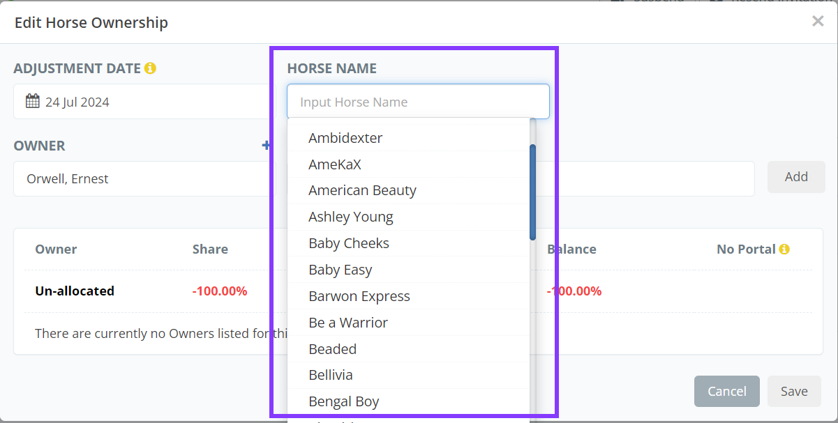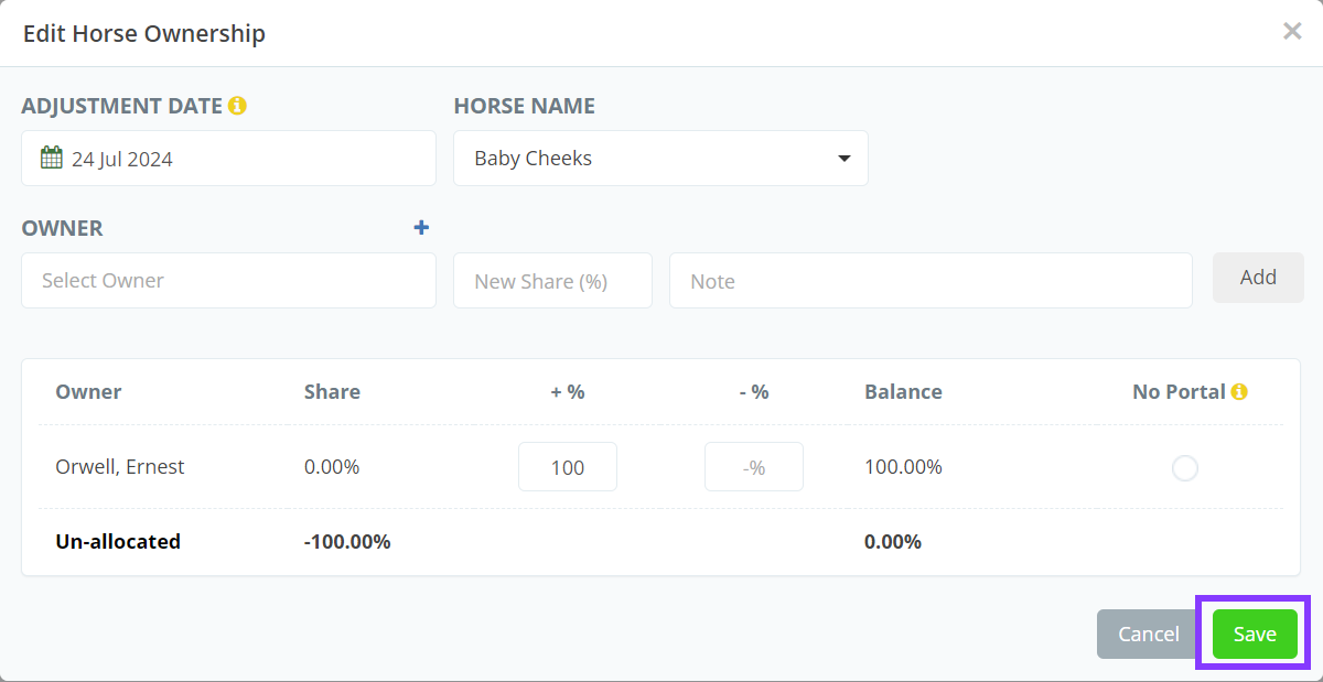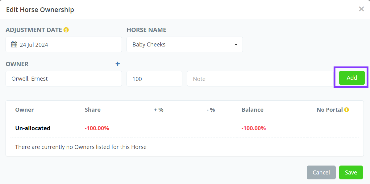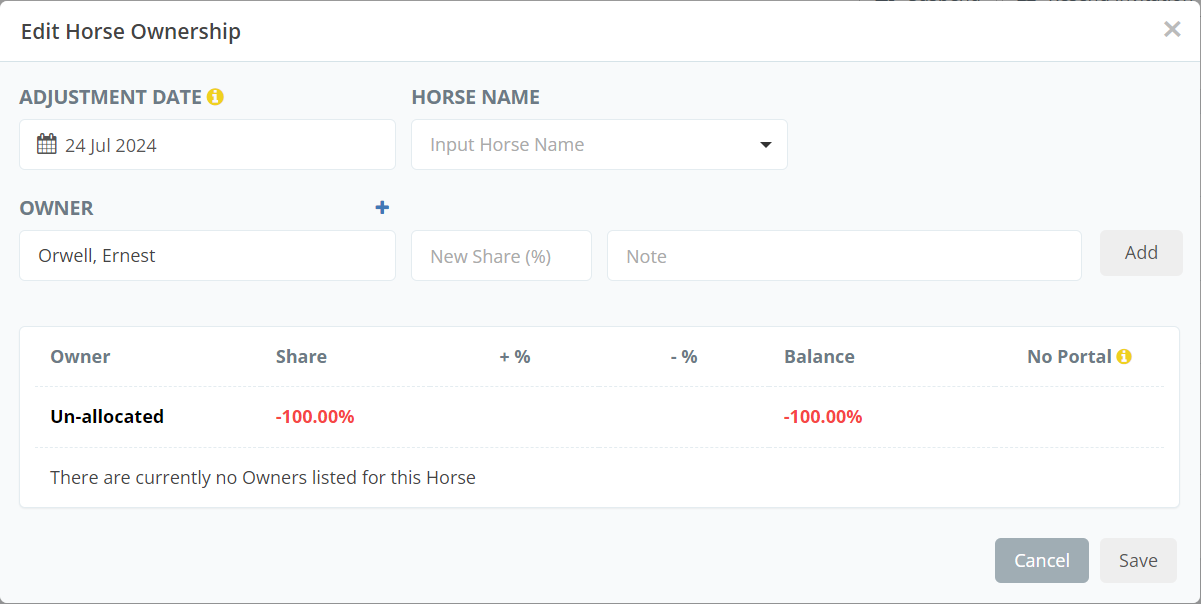 How to add owners to a horse or adjust an owner's ownership share in a horse