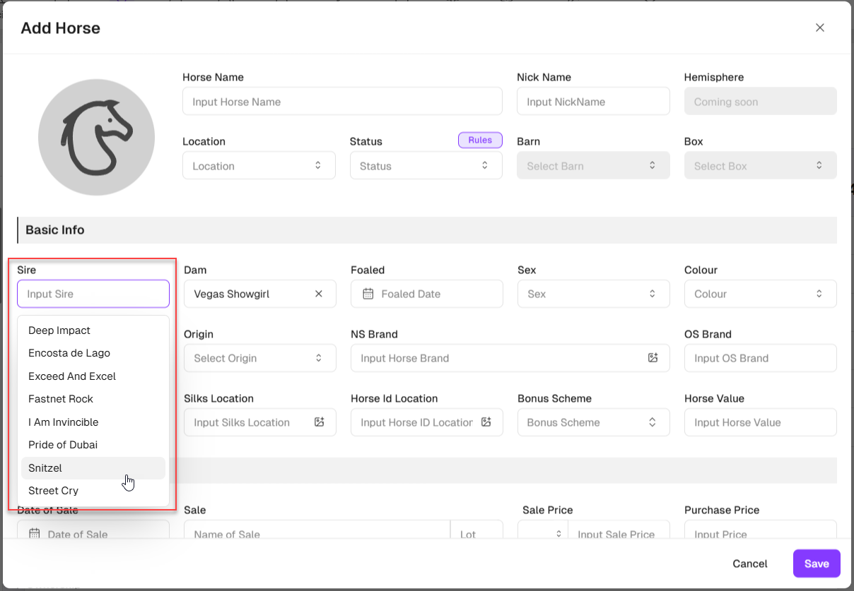 Select the sire of the unnamed horse you wish to add.
