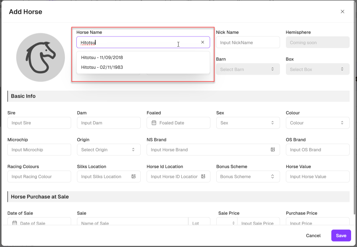 If you wish to enter a named horse, enter the horse's name or part of the horse's name. Wait for the lookup to the Australian Stud Book returns a list of named horses that meets your search, then select the correct horse (foal date is shown).