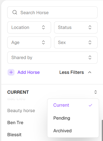 You can also easily filter for Current Horses or Archived Horses, and filter by Horse's current Location and/or Status.