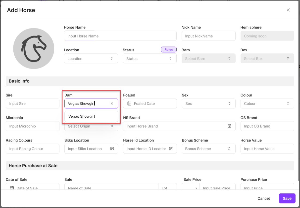 If you wish to enter an unnamed horse, enter the horse's date of birth (Foaled Date) then enter the dam or part of the horse's dam name. Wait for the lookup to the Australian Stud Book returns a list of dams that meets your search, then select the correct dam (foal date is shown).