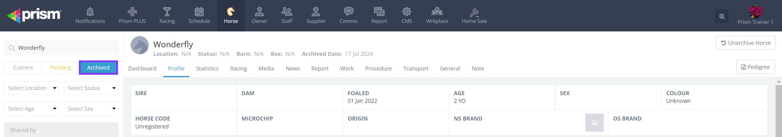 All archived horses will show up in the Archive tab, which is located just under the horse search bar.