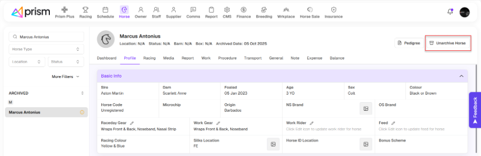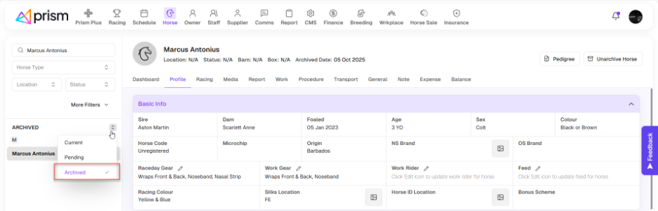 All archived horses will show up in the Archive tab, which is located just under the horse search bar.