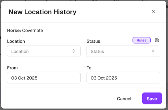 Enter the Location and Status (and optionally the Barn/Paddock and Box). Be sure to set the dates that the change was effective From and To.