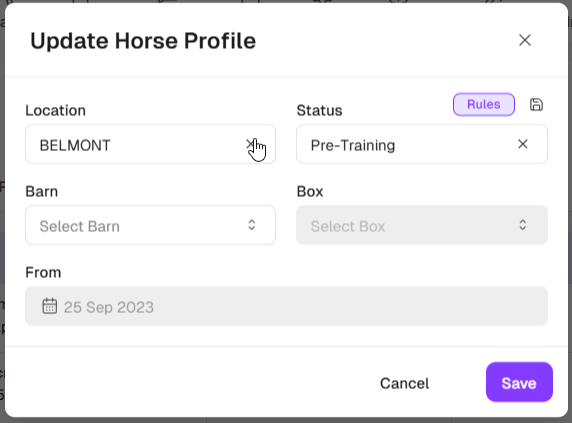 Then modify the Location and/or Status (and optionally the Barn/Paddock and Box). Be sure to set the date that the change was effective.