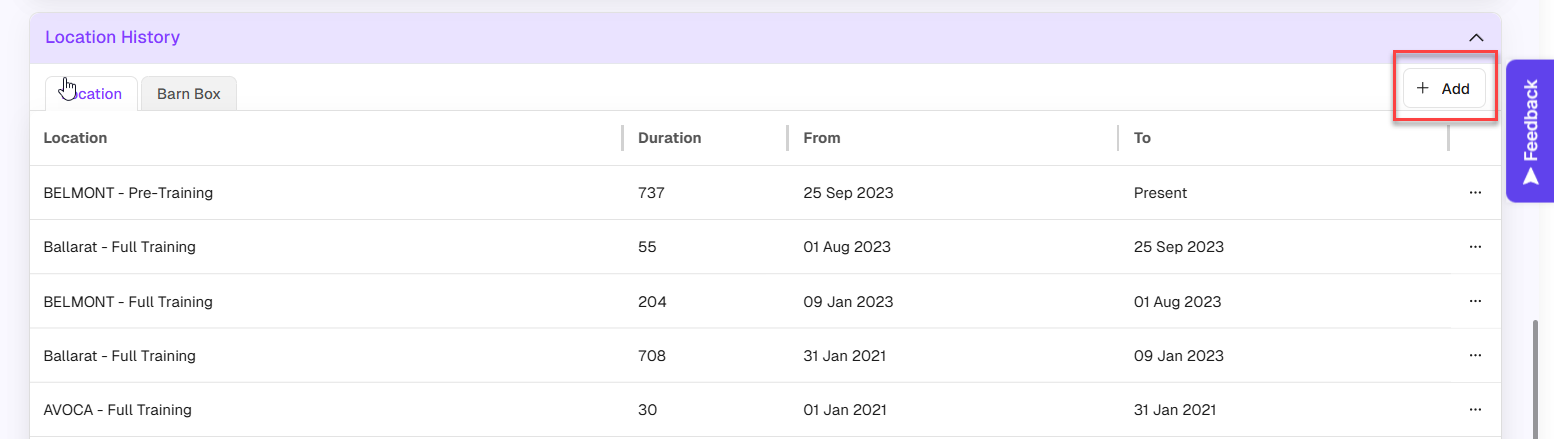 On the Horse Profile, scroll down to the Location History section. Then click Add.