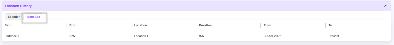 The Barn/Paddock & Box History data is displayed on the Horse Profile, next to Location History.