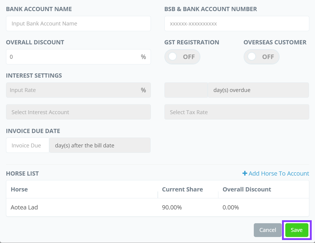 You can add owners to a horse via the horse's profile page. To save time, you can also add a horse directly in the owner's profile. Go to the Owner tab to see your owners list. Select the owner you wish to update in the list. Scroll down to the Horse ...