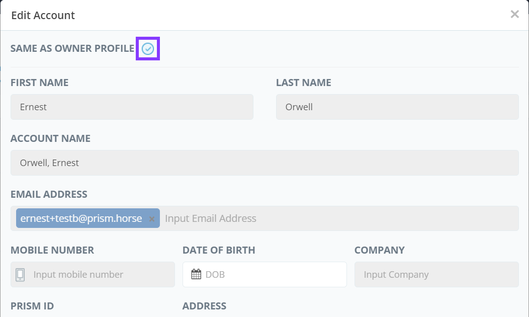 - If you tick on Same as Owner Profile, the system will copy the information saved on the owner's Profile tab.