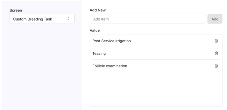 - Select “Custom Breeding Task” to show the list of custom breeding tasks on the right hand side. Here, you can add / edit / delete breeding task