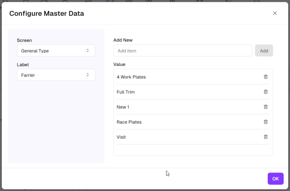 Before starting to record farrier tasks, you must first configure a master list of tasks.
