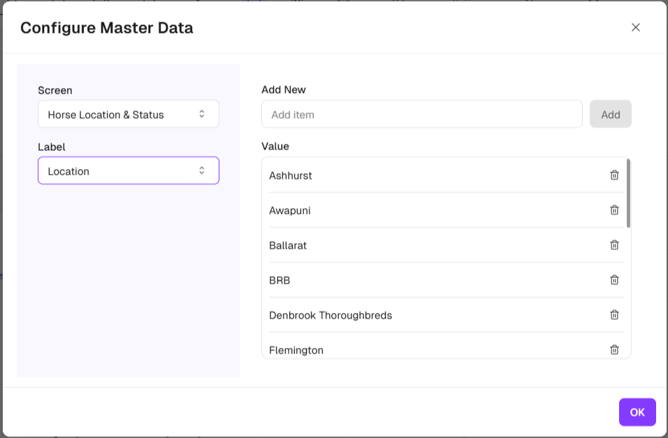 If you delete a Location to which Horses are currently assigned, or have been assigned in a period which has not yet been invoiced to Owners, you will be asked to update the location of each horse and the effective date.