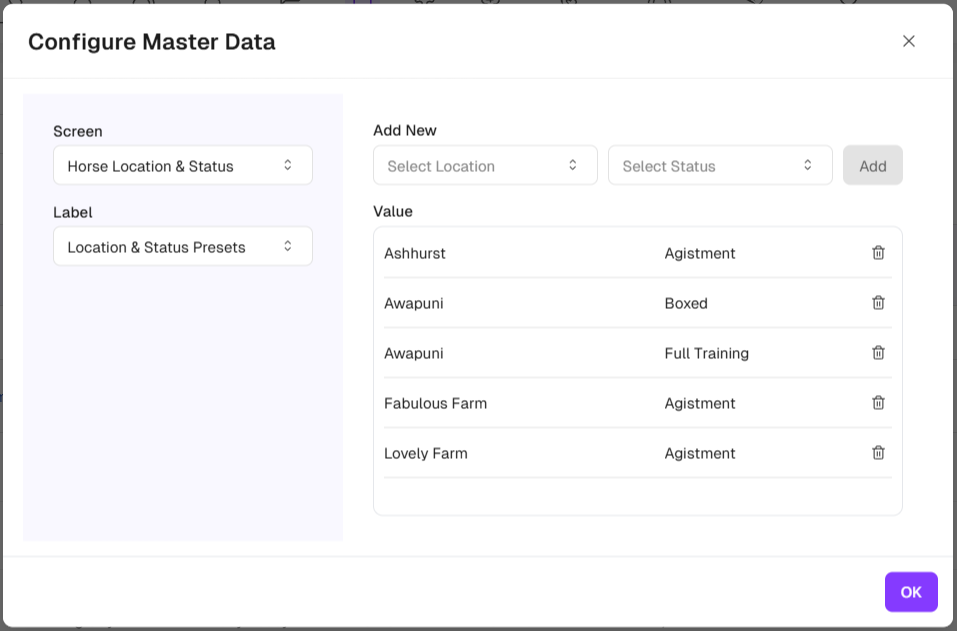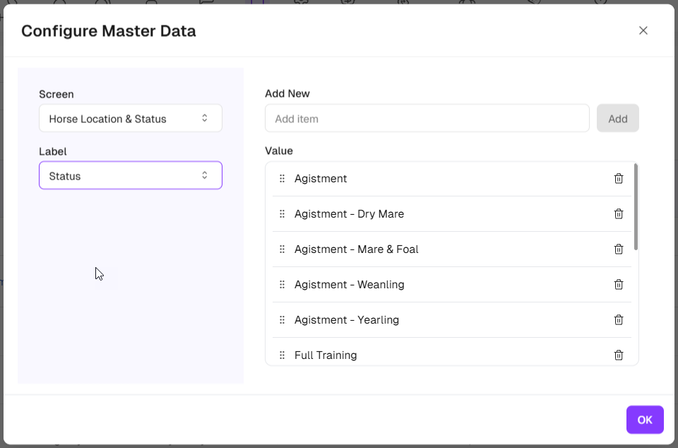 Configuring your Statuses that can be assigned to each horse is critical to keep track of the status of each horse and for invoicing any daily charges that may apply. Daily charges are applied to the combination of Location and Status assigned to each horse.