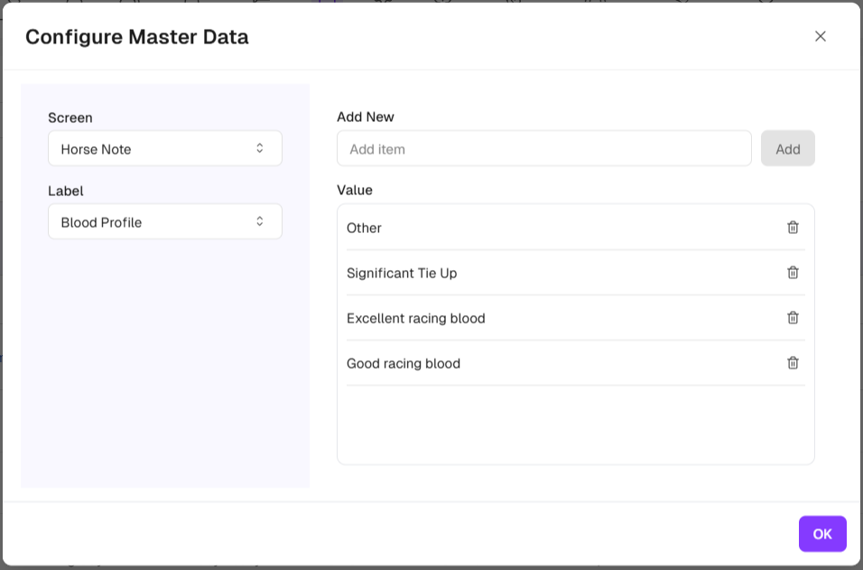 If you are training racehorses, you may wish to customise Scope Note results to reflect the most common results of post-race, post-gallop, during-gallop or at-rest scoping. Then customise Blood Profile Notes to quickly record results of routine blood profiles during training (e.g. "good racing blood", "tie-up", etc).