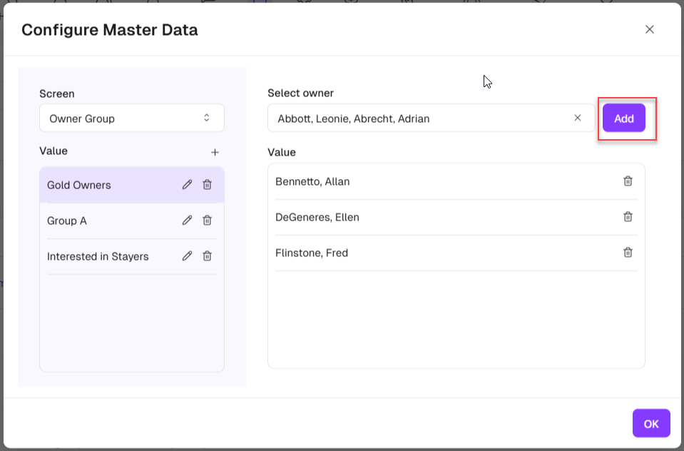 Once your Owner Group(s) have been configured, in each Owner Group, select one or multiple Owners from the drop-down list of Owners, and click the green <Add> button to add them to the Group.