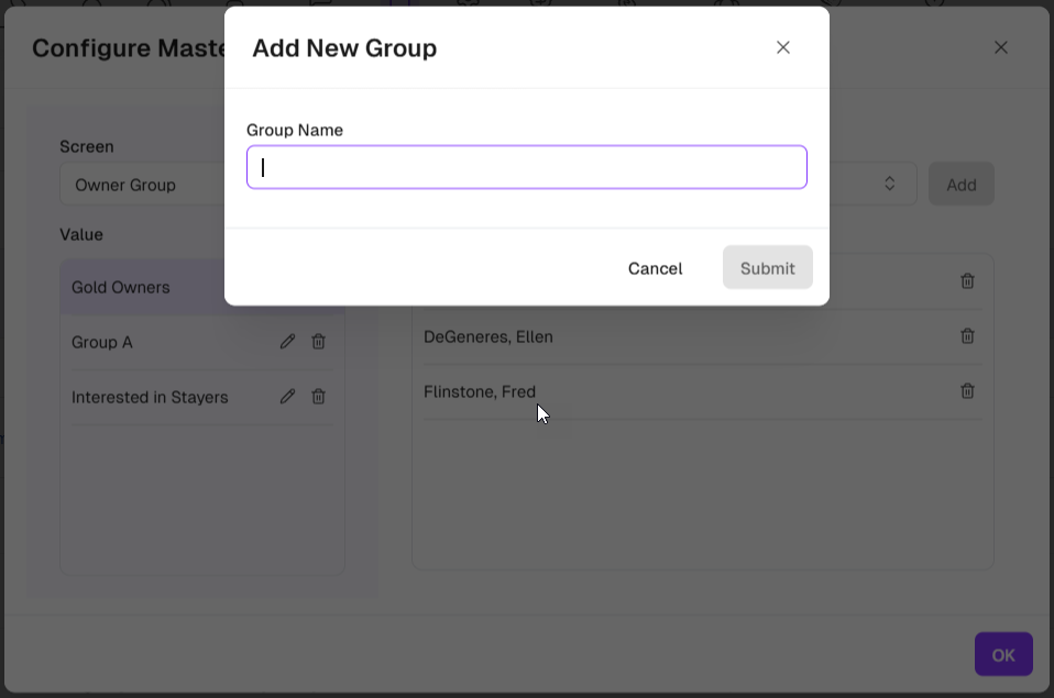 Click the blue + icon and enter the name of the Owner Group you wish to add. Or you can edit the name of any existing Owner Group, or delete any Owner Group.
