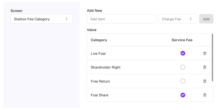 - For each Stallion fee Category, specify whether or not a Stallion Service Fee is charged.