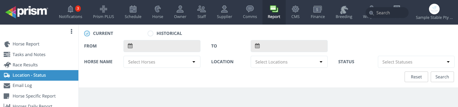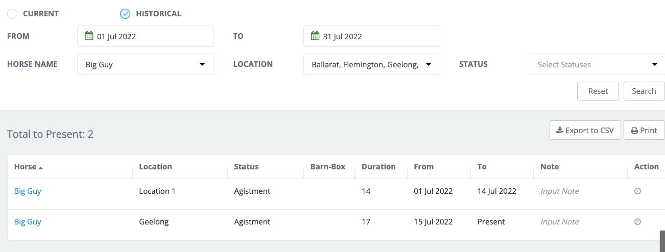 - Historical - to view location and status of each horse over a specified time period, including when changes occurred. Select a FROM and a TO date.