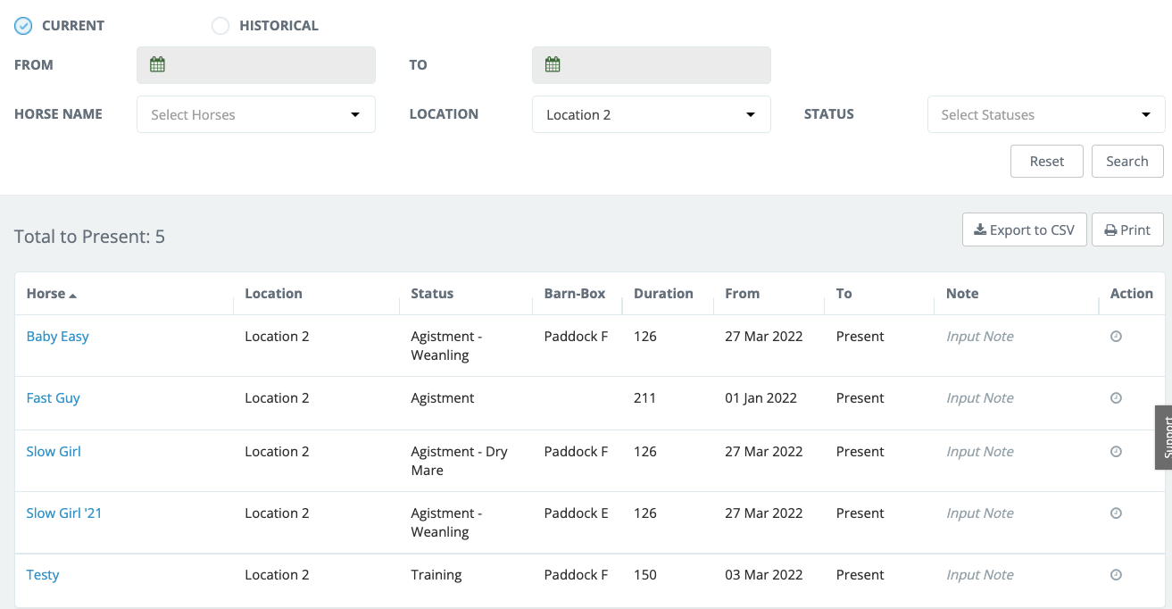 Apply Horse, Location and Status filters as desired, then click SEARCH. You can view, print or export to CSV. You can record Notes within the report to aid your operation.