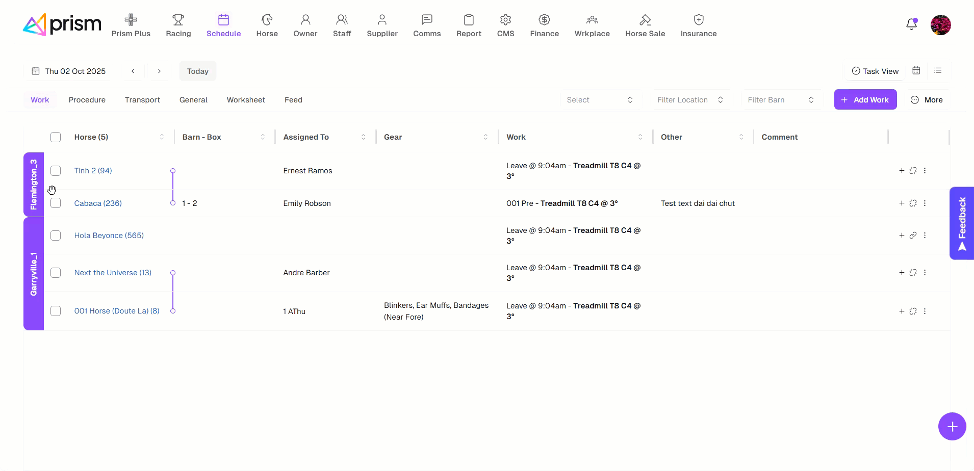 Work is also visible in each horse’s Work history as well as the rider's task list.