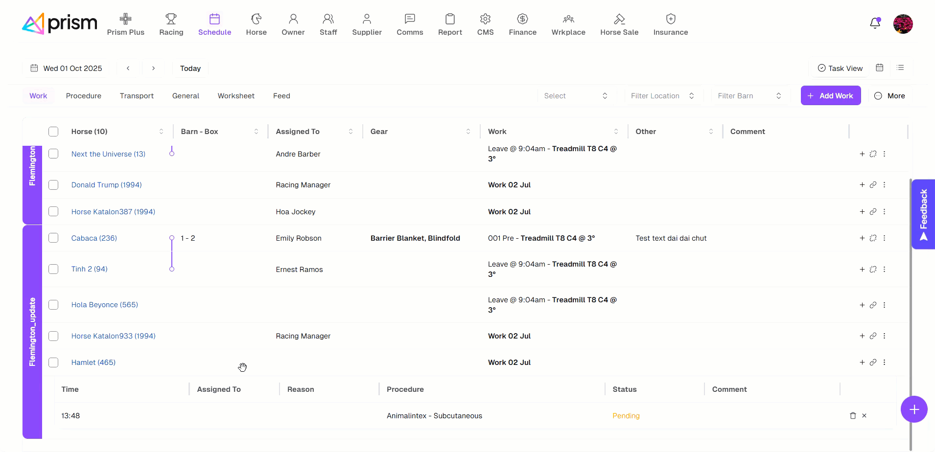How to view daily trackwork The Schedule Work page is designed to consolidate daily work tasks for all horses on the farm. It also provides advanced features such as horse linking, task copying, and grouping. Trainer can use Schedule work page There ...