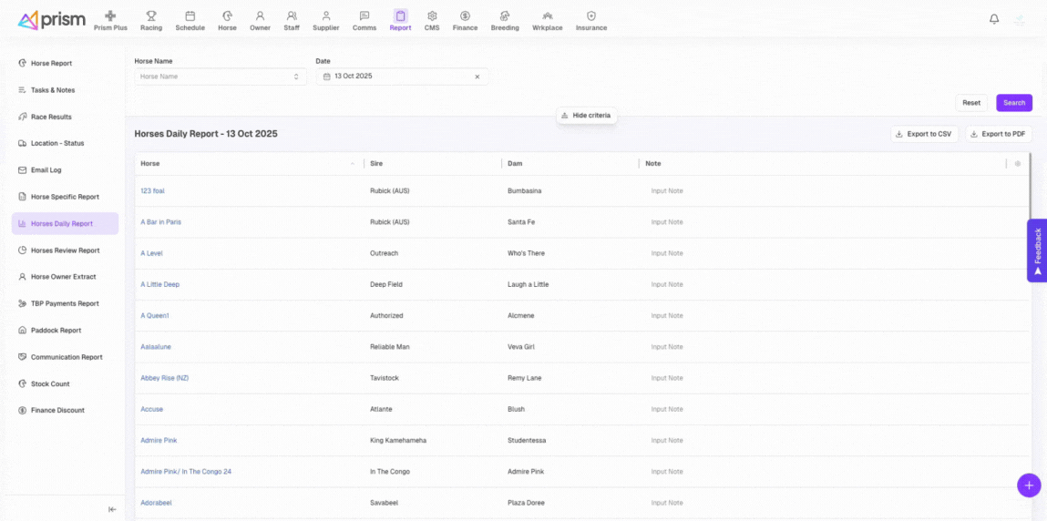 Report List Shows detailed horse records including Pedigree, Location, Status, Last Race, and Notes. Add Note Inline In the Note column, click Input Note next to a horse. Enter comments or updates. Press Enter or click outside the box to save. Search ...