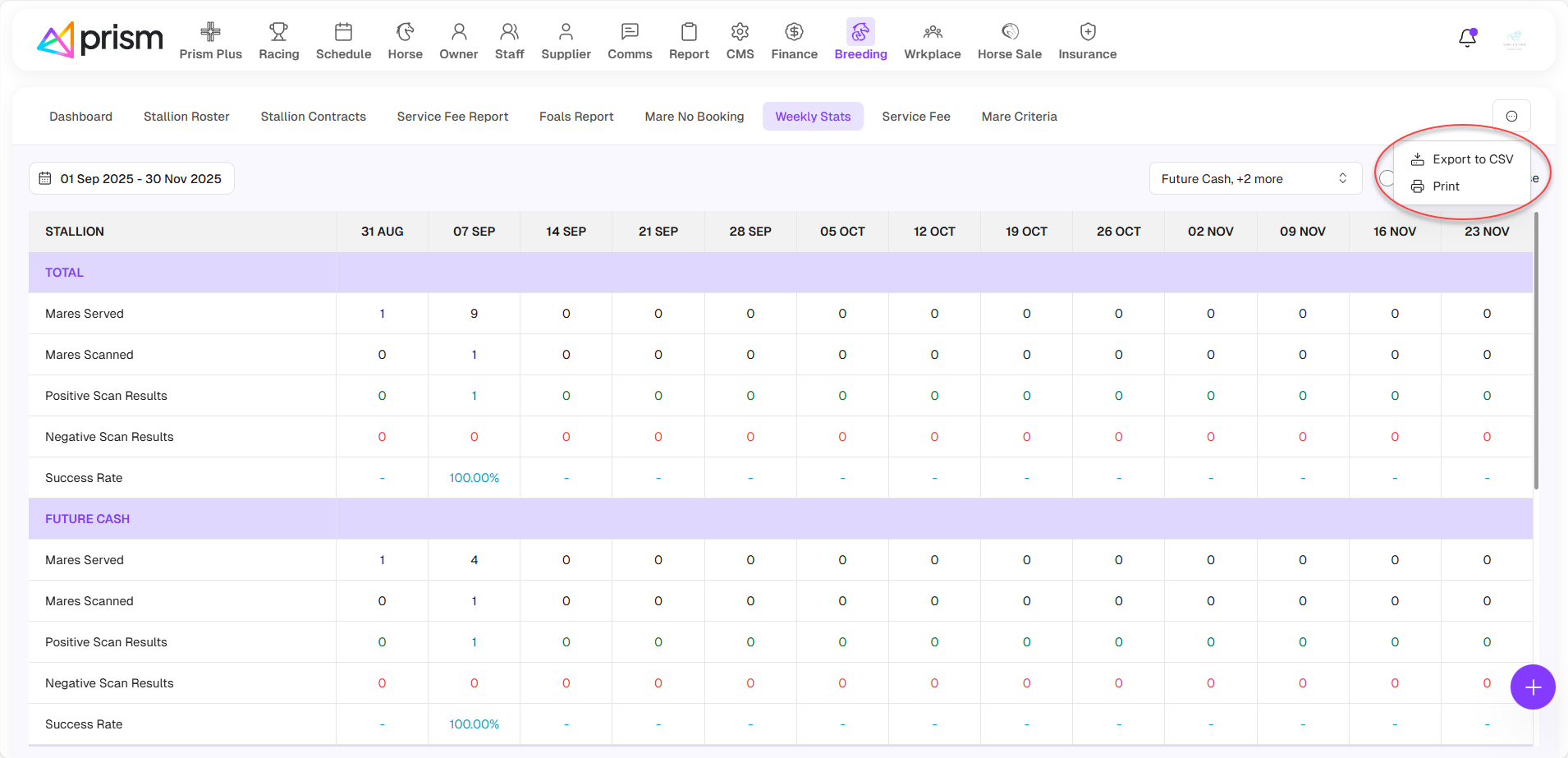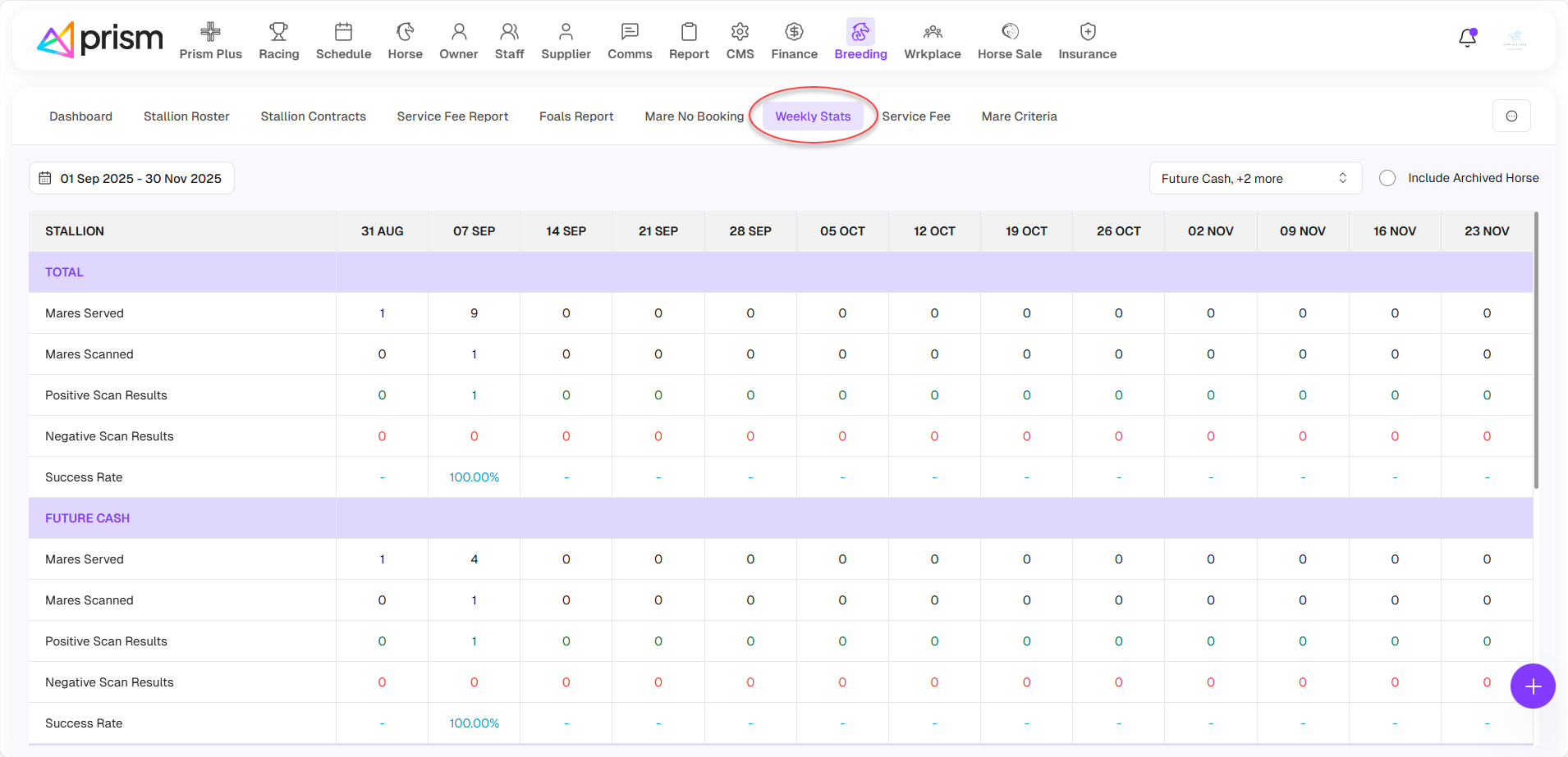 The Weekly Stats tab show stallion activities each week. That includes how many covers occurred, how many scans recorded, and the rate of positive pregnancies.