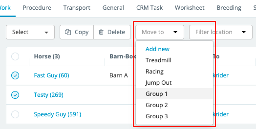 2. Click the Move to button and a drop down list appears. Select the group you wish to move the Horses into.