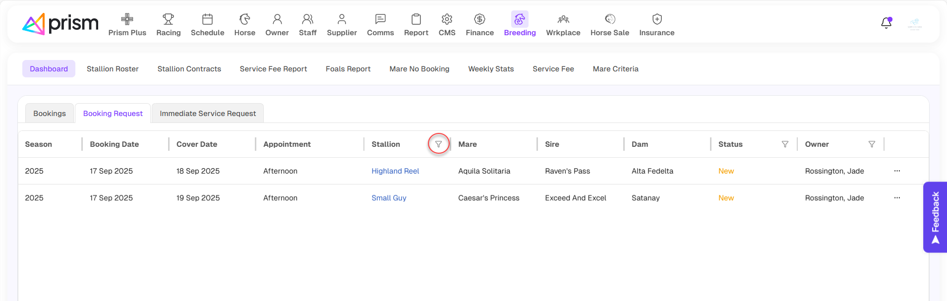 You can filter the list by Stallion, Status and Owner by clicking on the 'Funnel' icon next to the label of headings.