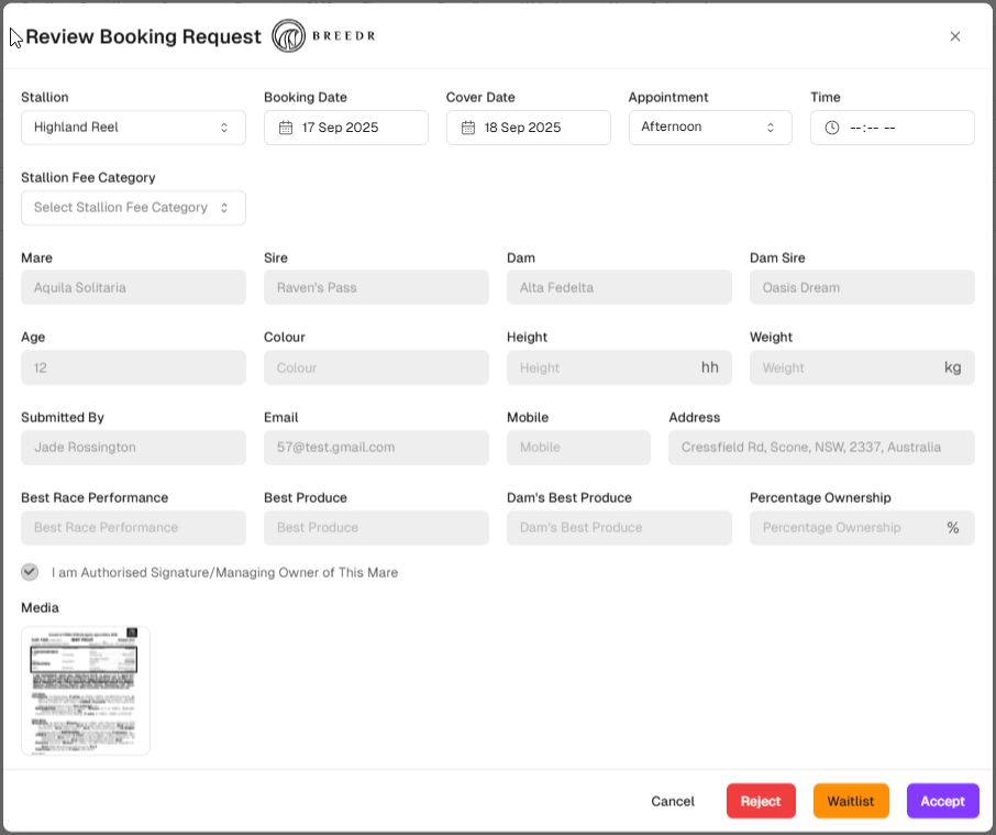 All stallions in your Prism portal (horses with type = stallion) are automatically listed on Breedr and available to receive nomination requests from breeders. To best promote your stallion(s), we recommend: