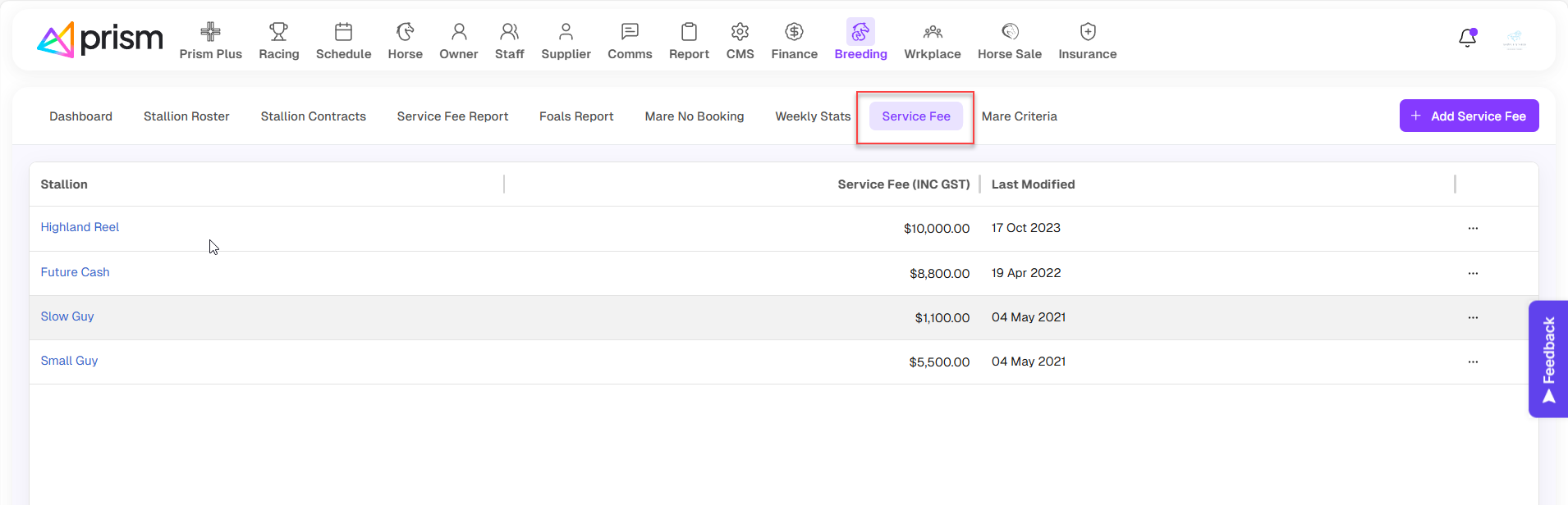 In the Breeding > Service Fee screen, maintain advertised stallion service fees to display on breedr.horse.